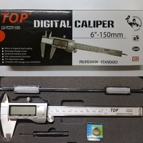 Thước cặp điện từ 0-150mm(6") TOP có 1 pin dự phòng, 1 tuốc nơ vít bake dùng để thay pin. Thước được đựng trong hộp nhựa.